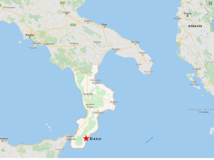 Calabria, Italy—with the town of Bianco highlighted (via Google Maps)
